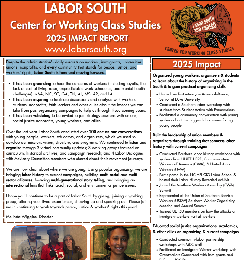 Despite the administration’s daily assaults on workers, immigrants, universities,unions, nonprofits, and every community that stands for peace, justice, andworkers’ rights, Labor South is here and moving forward. Continue reading →
